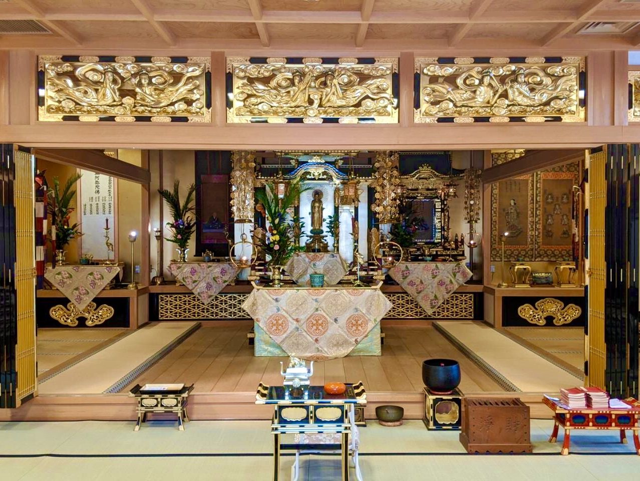 【教福寺外観】2007年に新築された2階建ての本堂です。駐車場もありますので、お車でもお越しいただけます。 【本堂・正面】正面に安置されているのがご本尊の阿弥陀如来。本堂にお飾りする仏花は住職が立てています。 【2階和室】葬儀の際の遺族控室や法事のお斎会場として活用されています。 【預骨用スペース】墓地への埋葬や納骨までの間、お骨をお預かりするスペースです。 Facebooktwitter